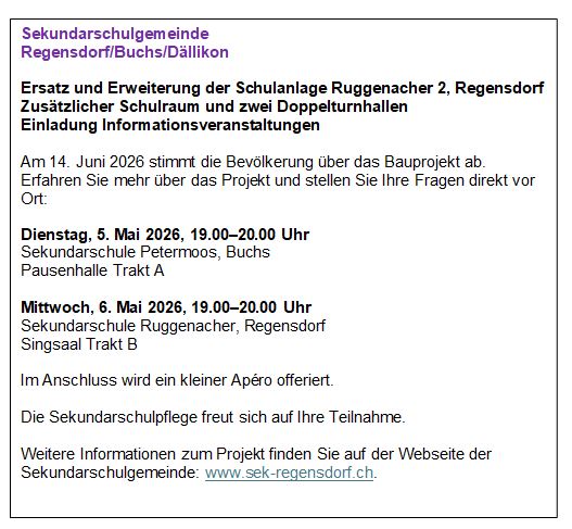 Informationsveranstaltung: Ersatz und Erweiterung der Schulanlage Ruggenacher 2, Regensdorf